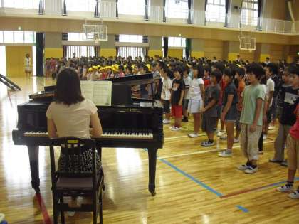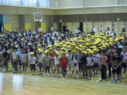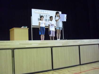 児童代表の言葉です。1学期を振り返って努力したことを一人一人発表しました。図工の作品づくりでがんばったこと、算数の授業をがんばったこと、長縄跳びでがんばったことなどを堂々と伝え、大きな拍手をもらいました。そして、全員で元気に校歌を歌いました。