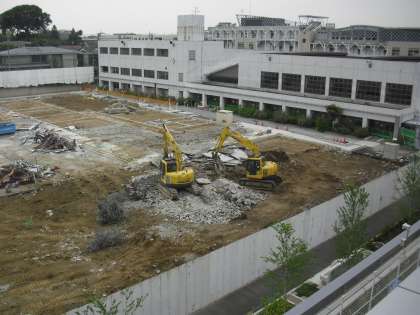 本日の仮設校舎解体工事の様子です。2台の重機で仮設校舎の第1昇降口周辺のコンクリートをはがしたり、砕いたりしています。校舎を支えていた厚いコンクリートが土の中から出てきました。