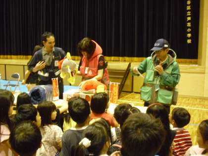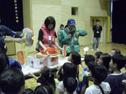 講師の方は、講演後、防災グッズ等の紹介もしてくださいました。渡部校長が女性用の防災ベストを着て、中に入っている防災用品を子どもたちに紹介しています。保護者の方々の関心も高かったようです。