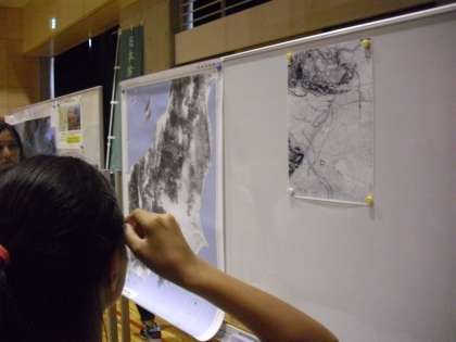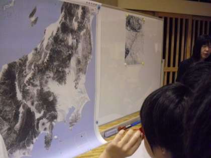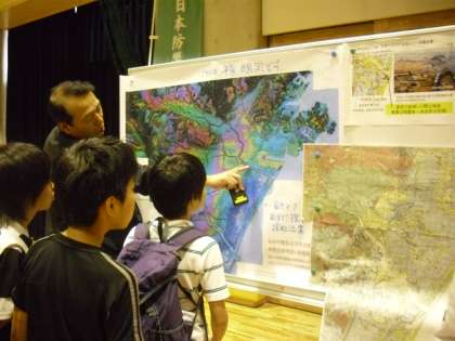 講師の方が、高学年に被災地の場所や地形について詳しく説明してくださっています。立体メガネで見ると標高差が分かる地図も持参してくださいました。