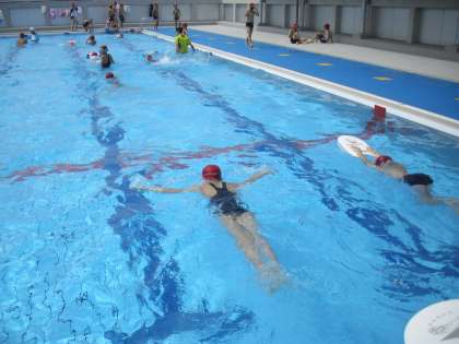 今日の水泳教室の様子です。自分の課題に応じた場で泳いでいるところです。ビート版を使って平泳ぎのかえる足の練習、50メートル等、高学年は自分の目標達成のために黙々と泳ぎ込みます。