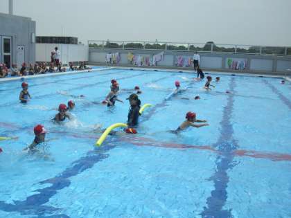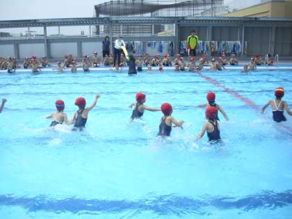 1・2年生の夏季水泳教室の様子です。導入の水の中を走ったり、もぐったりする活動です。水に親しむ水遊びです。水に親しむことから、安心して水の中で体を動かすことができるようになっていきます。