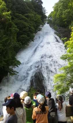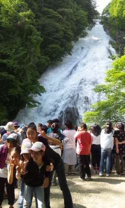 ハイキングが混雑のため時間がかかり、湯の湖半周ハイキング、源泉、足湯は省略して湯滝に来ています。ここも水量が多く壮大です。