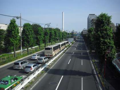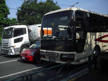 高井戸のインターを降りた連絡を受け、環八で待っていると、6年生が乗ったバスが見えてきました。学校側に停車するために一度通り過ぎてからUターンをして、配車位置に到着です。