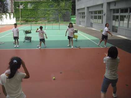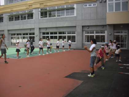 中学校の部活動と連携したサマーワークショップ「硬式テニス部体験教室」の様子です。午前中は女子の部です。まず、ボールに慣れるためにテニスボールを使って中学生とキャッチボールをします。