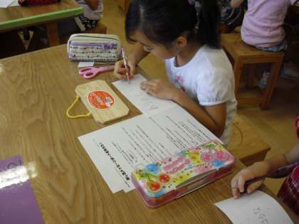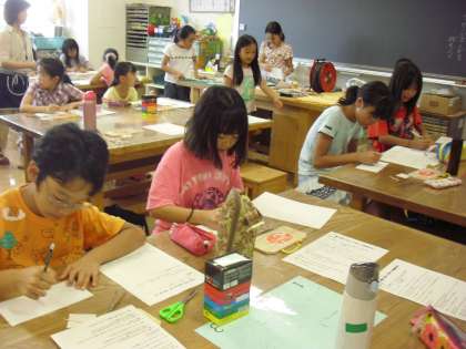 サマーワークショップ「押し花メッセージボード」づくりの様子です。木目の板でメッセージボードを作ります。まず、どんなメッセージにするのかを考えて、デザインのイメージ画を描きます。