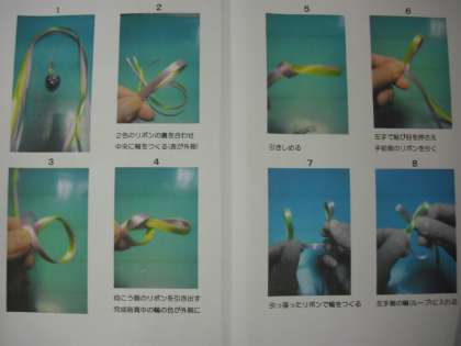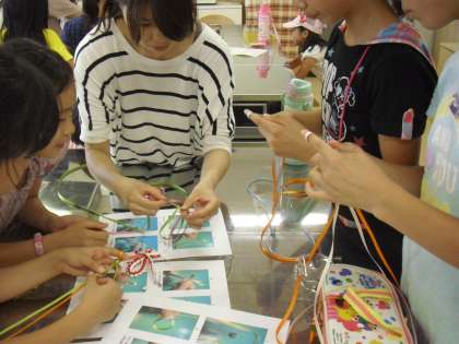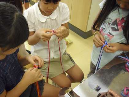サマーワークショップ「リボンストラップ教室」の様子です。講師は保護者の方々です。各テーブルをまわって子どもたちにリボンの編み方を教えます。同じ編み方のくり返しなので覚えてしまうと作業も進みます。
