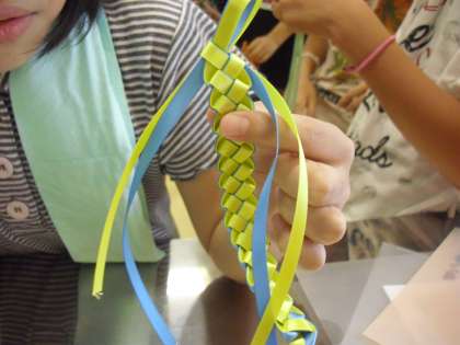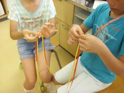 子どもたち同士でも教え合いながら編み進めます。30分ほど経つと、ストラップができるくらいの長さまで編み上げる子どもたちがでてきました。もう少しでできあがります。