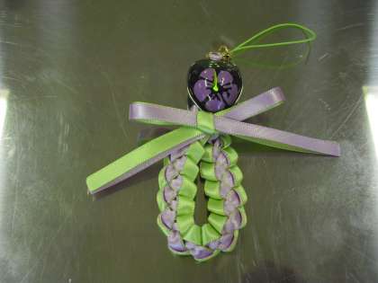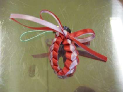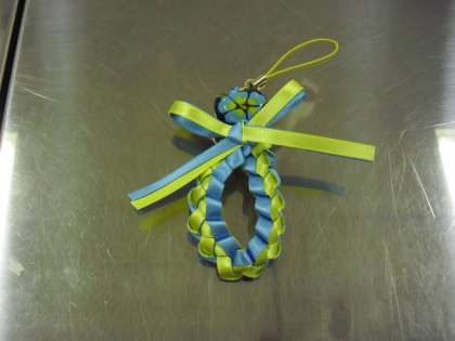 編んだリボンを丸めるようにして飾りを付け、きれいなリボンストラップが完成しました。子どもたちもうれしそうです。覚えた編み方で、オリジナルのリボンストラップ作りにもチャレンジしてほしいですね。
