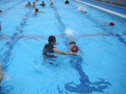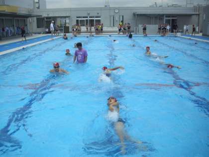 3・4年生の水泳教室の様子です。3・4年生は、しっかりとした息つぎを身に付けることで、ある程度の距離を泳ぐことができるようになります。低学年でのバブリングやボビングが息つぎにつながってきます。