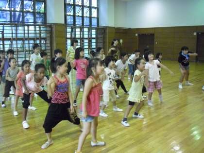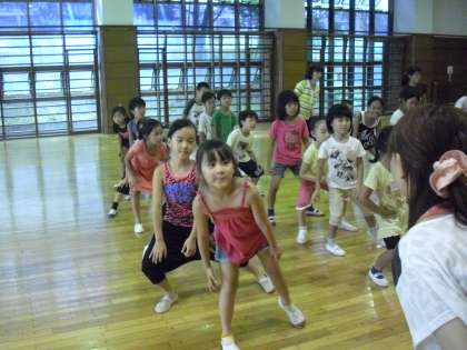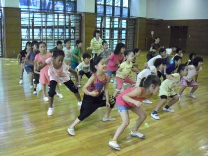 みんなでタイミングを少しずつずらしながら、人気グループのパフォーマンスのように体全体を使って円を描くように動いています。子どもたちも気分がのってきました。
