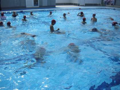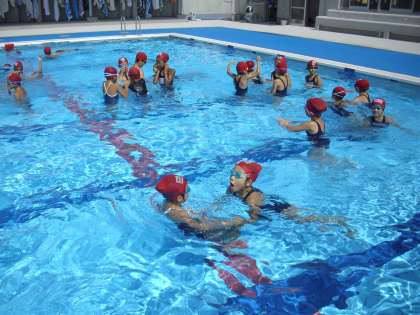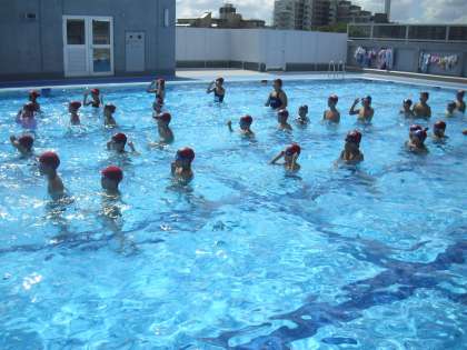 3・4年生の水泳教室の様子です。始まったばかりで水慣れをしているところです。二人組になって、水中ジャンケンをします。負けた人は、勝った人を10秒間引っぱってあげます。遊び感覚ですが、もぐる・浮く要素を取り入れています。