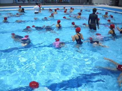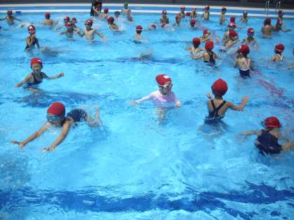 1・2年生の水泳教室の様子です。鬼ごっこをしたり、浮き遊びをしたりしながら水と仲良くしているところです。楽しそうな声が聞こえてきます。