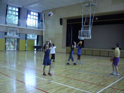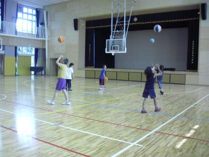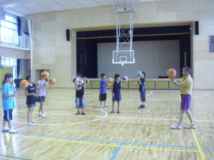 サマーワークショップ「バスケットボール教室」の様子です。今日も中学校の野口校長が指導してくださいました。まずは、ボール慣れからです。動きながらボールを投げ上げて指先でキャッチします。