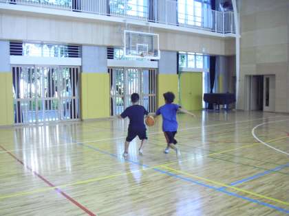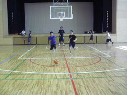 トスされたボールを1対1で追いかけ、ボールをキープしたらゴールに向かってシュートを打ちに行く練習です。攻防の速い切り換えが必要です。本格的なバスケットボールの練習を体験することができました。