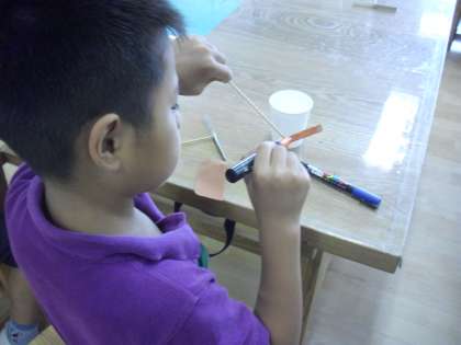 講師の先生に見てもらって合格をもらったら、瞬間接着剤で羽と竹ひごを固定します。子どもたちは、自由に羽に色や模様を付けていきます。完成したら、廊下に出て飛ばしました。舞い上がる竹とんぼを見て、とても嬉しそうです。