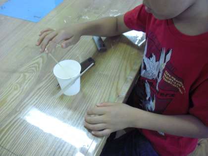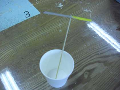 やはり、紙コップの上に乗せて羽の左右のバランスを確かめながら、重いほうを削っていきます。バランスが整ったところで、接着剤で固定し、完成です。手作りの竹とんぼができました。