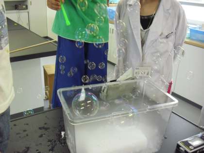 科学講座「マジカル・シャボン」の様子です。中学校の理科の講師の先生が指導してくれました。ドライアイスを入れた水槽に、シャボン玉を吹きかけると、水槽の中でシャボン玉が浮いています。不思議な現象に子どもたちも大喜びでした。