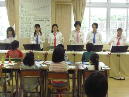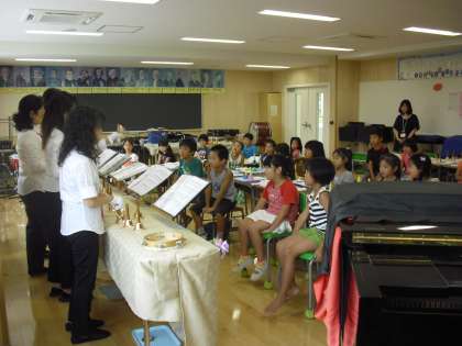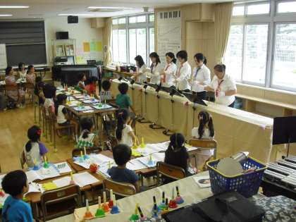 サマーワークショップ「ミュージックベル」の様子です。講師は世田谷区を中心に活動しているハンドベル奏者の先生と、先生と共に活動している皆さんです。まず、子どもたちに素晴らしい演奏を2曲披露してくれました。2曲目は、人気アイドルグループの曲で子どもたちも喜んでいました。