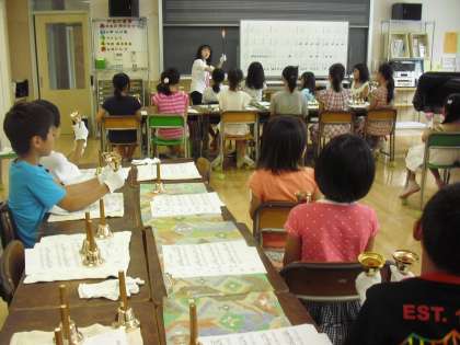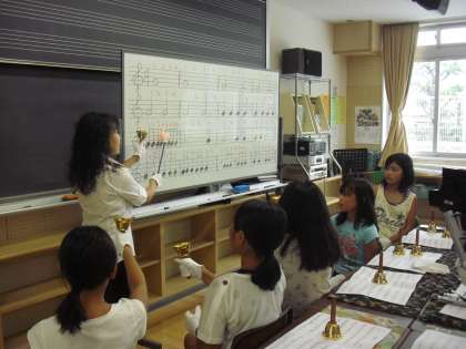 早速、ハンドベルの練習です。はじめは全体で、音符の音の長さとベルの扱い方を練習します。学年毎にグループが分かれており、1〜2名、指導してくださる方がついています。練習を重ねるごとに音の響きがきれいになってきました。