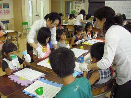 学年毎に分かれているグループごとの練習です。「キラキラ星」「山の音楽隊」「エリーゼのために」「星に願いを」等、学年毎に曲が違います。楽譜には自分の担当する音のベルをいつ鳴らすのかが示されています。グループ担当の方が熱心に教えてくださいました。