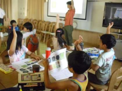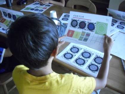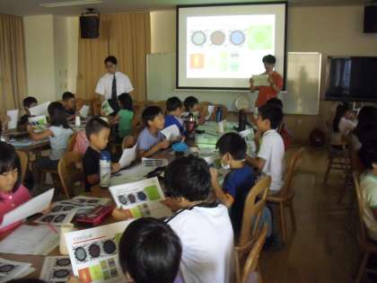 サマーワークショップ「科学教室『ルークの冒険』」の様子です。1年生から3年生までが対象です。講師は、金沢工業大学虎ノ門大学院教授の三谷宏治先生です。三谷先生は本校の学校運営委員でもあります。前半のテーマは「イロのふしぎ」です。様々な色の形や模様が描かれたシートを見ながら、ふしぎを発見していきます。じっと見ているだけでなく、シートを左右や前後に動かしながら不思議を探していきます。