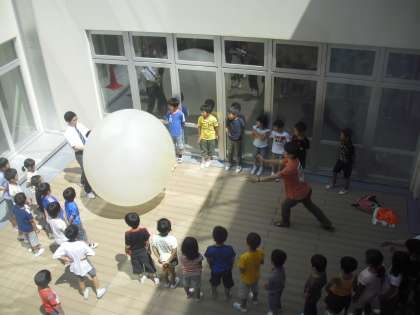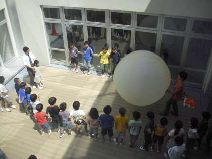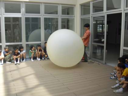 最後は、大型バルーンを使っての空気の重さを体感する実験です。子どもたちは大喜びでした。バルーンがぶつかってきたときの感触を楽しんでいました。低学年の子どもたちも、科学への興味や関心が高まったことと思います。
