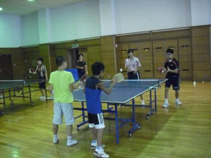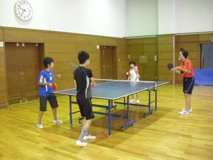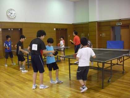 中学の部活動と連携したサマーワークショップ「卓球部体験教室」の様子です。中学生が小学生にラケットの持ち方、打ち方を教えてくれています。卓球台の対角線を使ってレシーブの練習です。