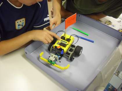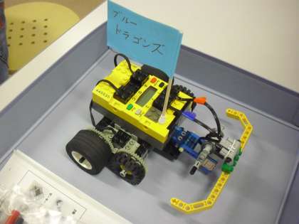 完成したのは、タイヤの付いた車型のロボットです。自分たちのロボットに名前を付けて旗を立てます。子どもたちもうれしそうです。