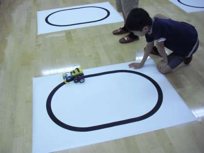 最後のレースに備えて、コースとなる黒いラインに沿って走るようにプログラムします。2人で協力してプログラムを作成し、ロボットに転送し、試してみます。