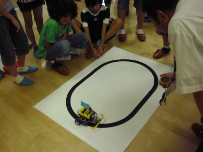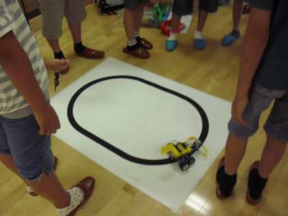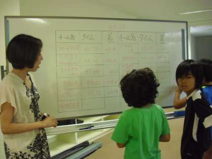 いよいよレースの開始です。タイムはホワイトボードに記録していきます。40秒に近い記録が出る度に盛り上がります。チーム毎に40秒に近づけようと工夫した走りをしています。