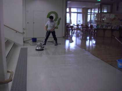 主事さんが廊下のワックスがけをしているところです。大きな校舎なので、計画的に少しずつすすめています。ワックスをかける前に、ゴミを取って磨き上げる作業があります。ワックスも二度塗りです。2学期に子どもたちが気持ちよく生活することができるように手間をかけています。