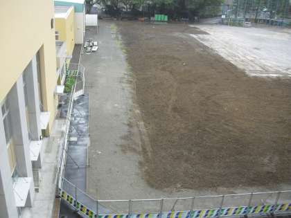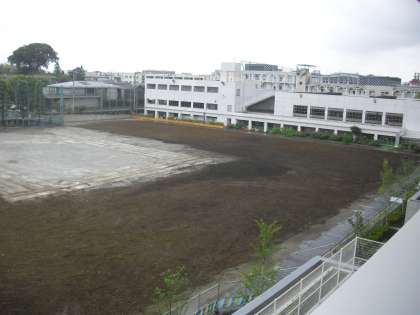 5年3組の教室から見た校庭の様子です。久しぶりの雨が降っています。工事もなく、とても静かです。大きな校庭を子どもたちが力いっぱい走る姿を想像するとわくわくしてきます。