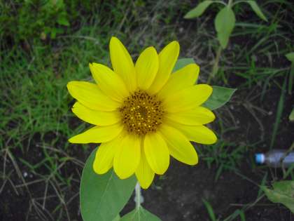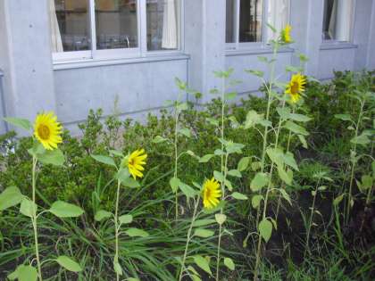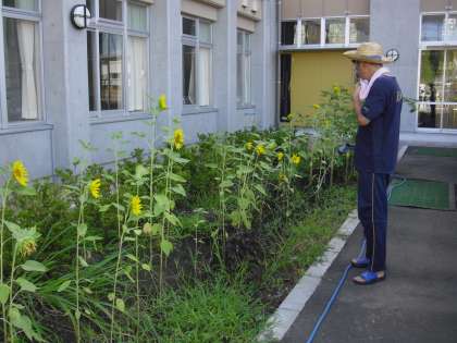 日直の先生が、植物に水をあげているところです。暑さにも負けずに、ヒマワリの花が元気に咲いています。シャワーを浴びて気持ちよさそうです。