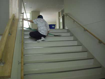 植物階段のワックスがけの準備をしているところです。ワックスをかける前に、磨いているところです。一段一段丁寧に手作業で行っています。