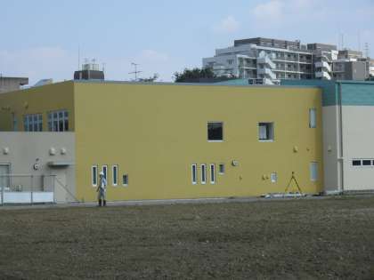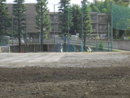 校庭整備等工事が再開します。大きな動きはありませんが、今日は数名の作業員の方たちが、校庭の様々な場所から測量を行っています。
