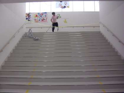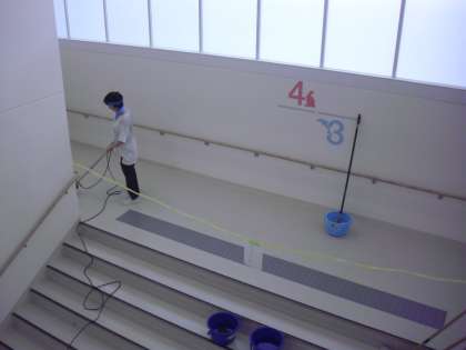 動物階段のワックスがけの様子です。広い動物階段も汚れを十分に落としてからワックスをかけます。2学期に向けての準備も着々と進んでいます。