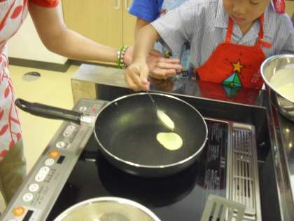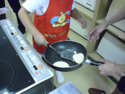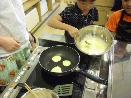 グループ毎に分かれ、パンケーキ作りの開始です。各グループには、講師の先生、ボランティアの保護者、教員が1名付いて、子どもたちが安全に作業ができるようにしました。ボールの生地をスプーンですくってフライパンにのせます。表面にブツブツと穴が見えたら裏返します。
