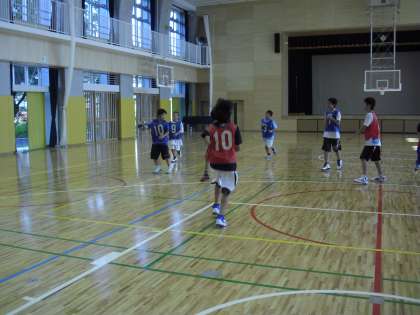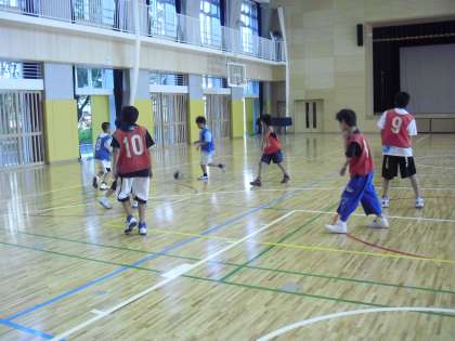 中学生と混合チームを作って、ゲーム形式での練習です。中学生はシュートせずに、小学生にどんどんボールを集めてくれます。パスを受けるために、どこへ移動すればよいのか等の指示を出してくれます。