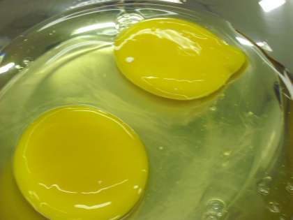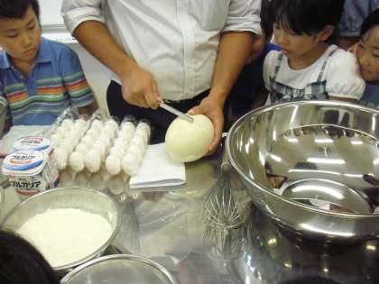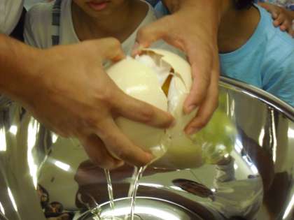 3年生から6年生までのサマーワークショップ「ダチョウの卵でパンケーキ」の様子です。ダチョウの卵を割って大きなボールに移しているところです。なんと、黄身が2つありました。ダチョウの卵としてはたいへんめずらしいことだそうです。