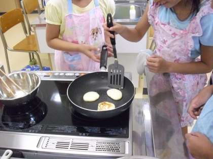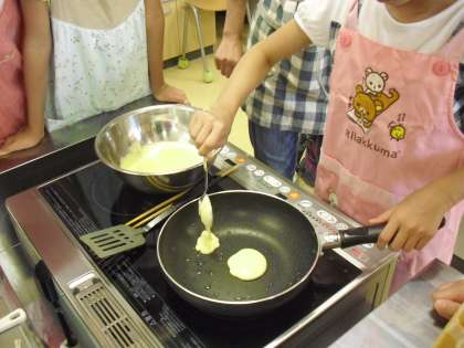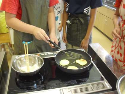 フライパンに油をぬって、生地をおいていきます。高学年はなかなかチームワークよく協力して作業を進めることができます。1回に3枚のパンケーキが目安です。