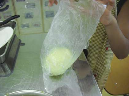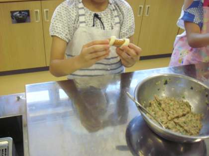 冷蔵庫で休ませた生地をとり出し、ちぎって細長くのばして、ウインナーに巻き付けます。ウインナーロールまんを作ります。子どもたちも楽しそうです。