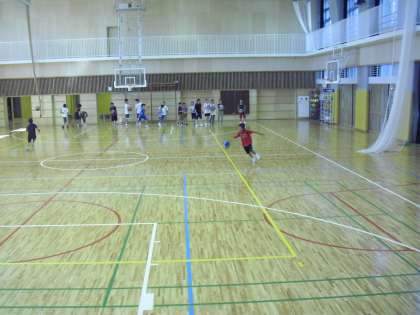 野口校長がトスしたボールを全力で追いかけ、ボールをキャッチしてからのドリブルシュートです。子どもたちは、コートを力いっぱい走ります。