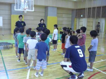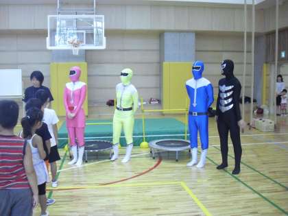 サマーワークショップ「スーパーマン体育」の様子です。まずは、講師の先生とあいさつしました。講師の先生から「レンジャー!と大きな声で呼んでみましょう。」と言われみんなで「レンジャー!」と呼ぶと、ヒーロー戦隊たちが手伝いに来てくれました。子どもたちも大喜びです。