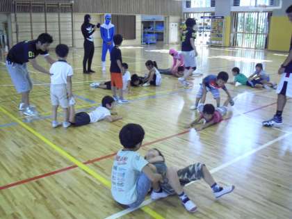 まずは2人1組になっての運動です。両手を組んで相手の足を踏めば勝ちです。もちろん踏まれないように逃げます。その次は、一人が腹ばいになり、相手が体をひっくり返そうとしたら踏ん張ってひっくり返されないようにします。力が入ります。