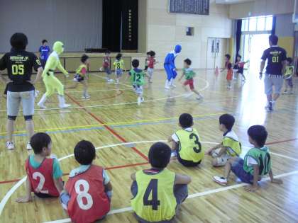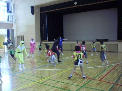 しっぽ取りをしました。レンジャーたちが、子どもたちが着けたしっぽを取りにいきます。しっぽを取られた人は、コートの外に出ます。子どもたちは、また、走り回りました。