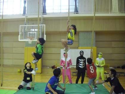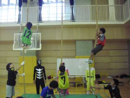 のぼり綱を使った運動です。綱の途中に付けた赤い印のところまでのぼります。力が入ります。赤い印までのぼれば点数が入ります。チーム戦なので、応援にも力が入ります。