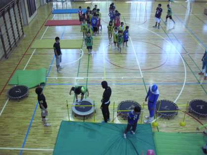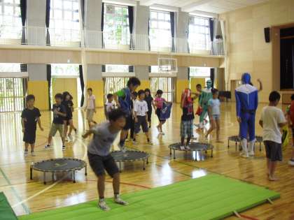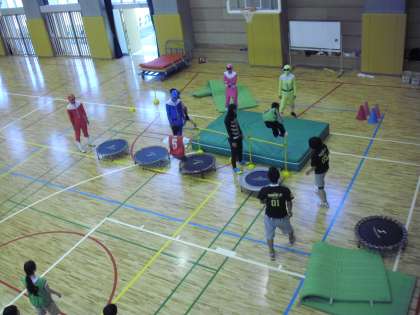 3年生以上のスーパーマン体育の様子です。トランポリンも勢いをつけて、高く大きなダイナミックなジャンプを意識します。空中で自分の体のバランスを操作します。子どもたちも思い切りよく取り組んでいます。