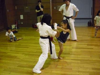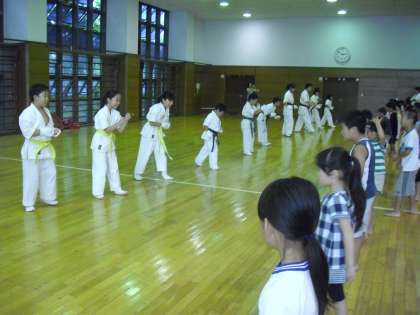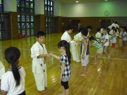 組み手が終わり、礼をして最後に握手を交わしました。参加した子どもたちは汗をかきながらも、空手の体験を通して礼儀や集中力を学ぶことができました。また、芦星会の小中学生が丁寧にやさしく接していたので、活動を充実させることができました。