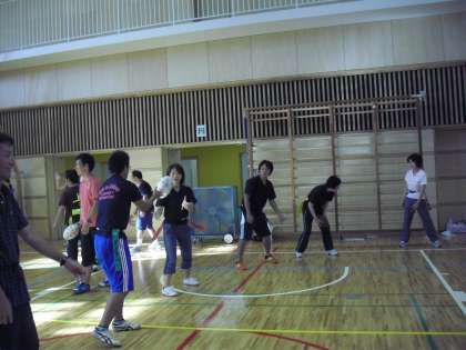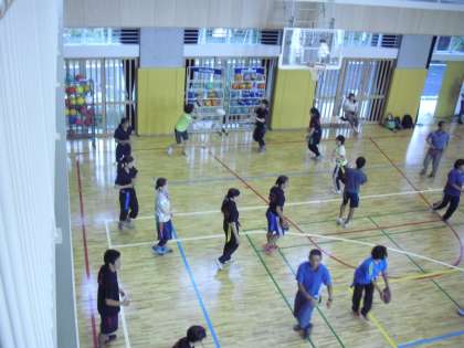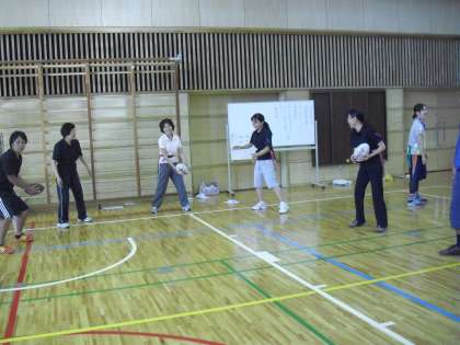 楕円型のボール操作の練習です。円になってパスをまわします。複数のボールを使ってボールに多く触れるようにしています。ラグビーは自分より前にパスができないので、後ろにパスを出す意識をもつことが大切です。